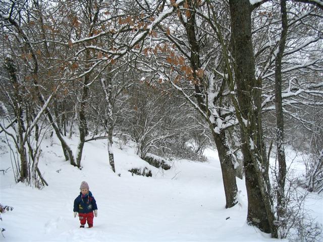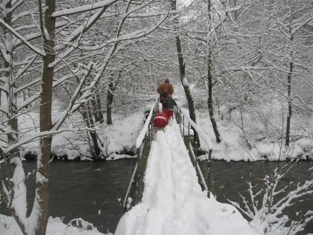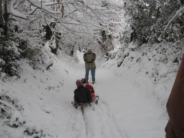 • sneeuw vrij, de schoolbus rijdt niet, dan maar op pad met de slee